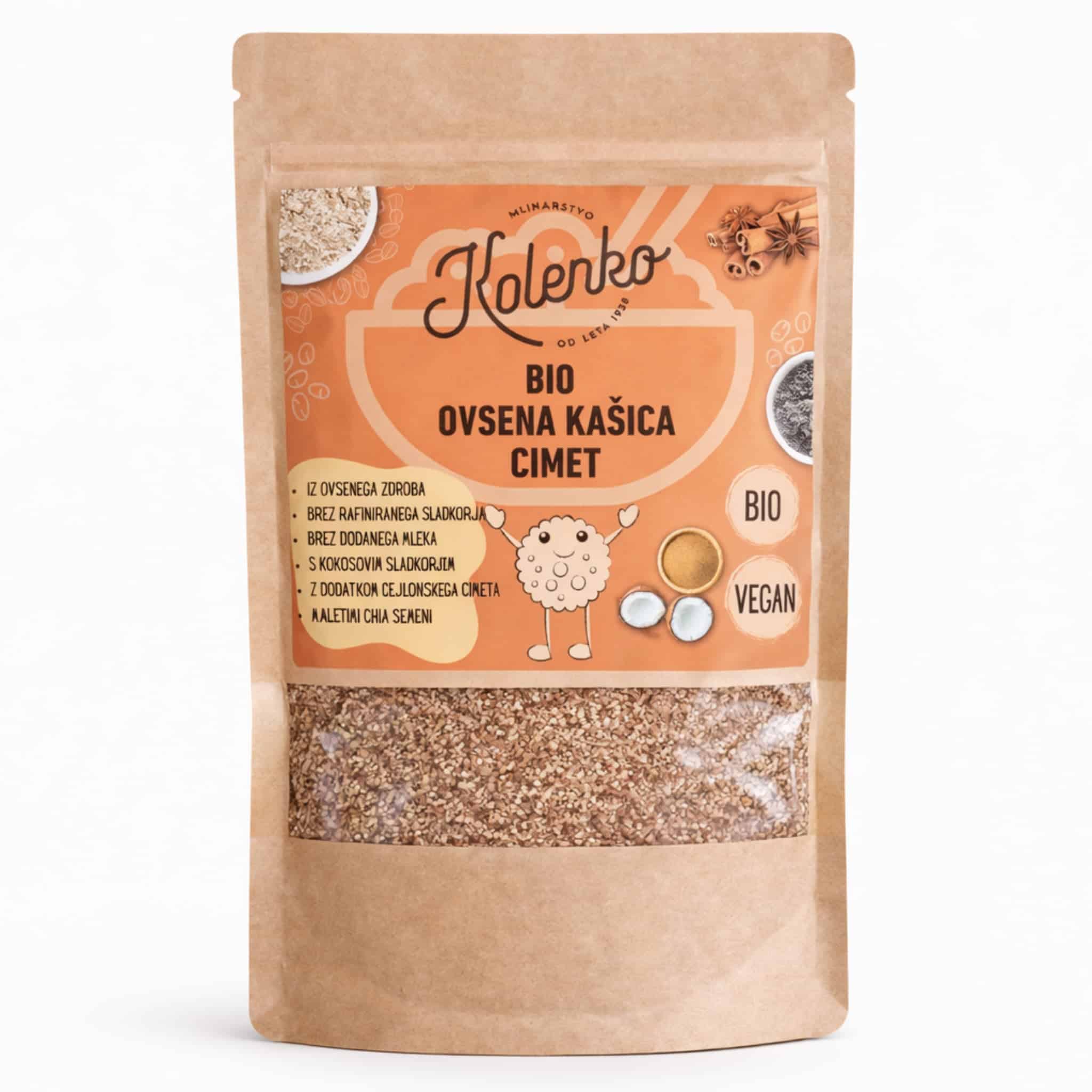 Kašica vsebuje ovseni zdrob, cejlonski cimet, kokosov sladkor in mleta chia semena.
