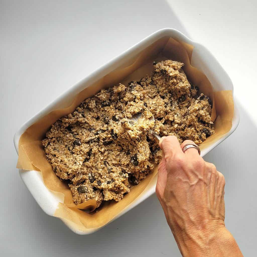 Pekač obloži s peki paprijem. Zmes razporedi po pekaču in z žlico pritisni ob dno.