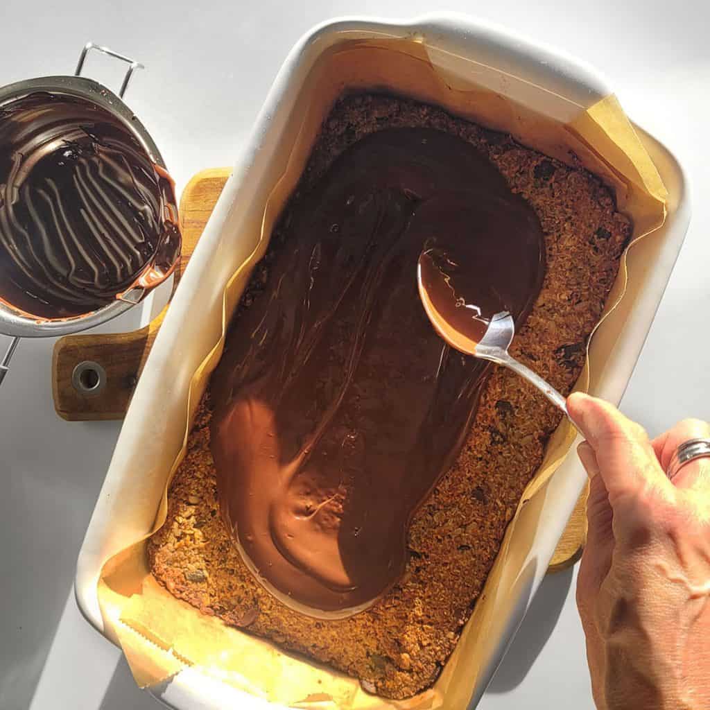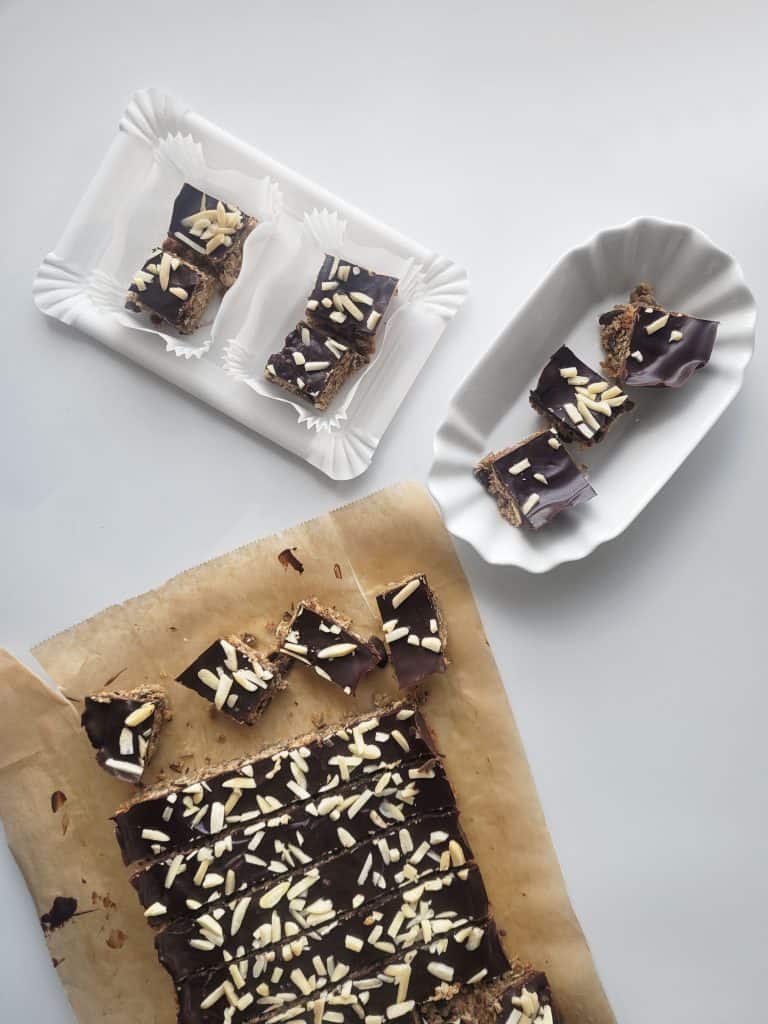 Počakaj, da se peka ohladi. Med tem nad vodno kopeljo stopi čokolado in prelij čez peko. Nadevaj z narezanimi mandlji in postavi v hladilnik, da se čokolada strdi. Nato odstani iz pekača in nareži na poljubno velikost. Tablice hrani v nepropustni posodi v hladilniku.